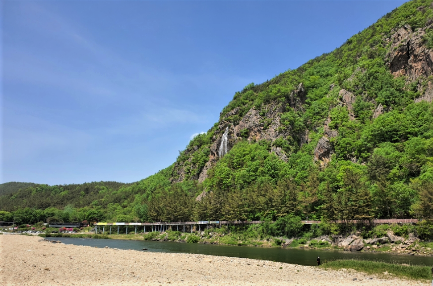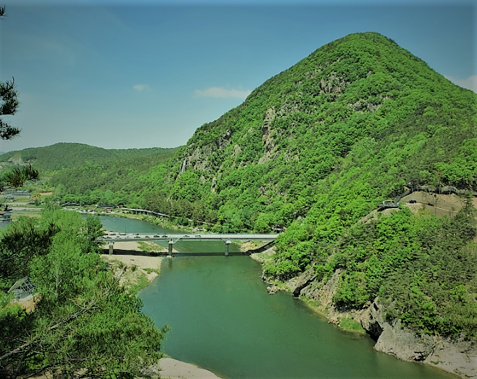 출렁다리를 건너 부엉산 전망대에 도착한 후에는 좌측 계단을 따라 내려가 다리를 건너 주차장으로 회귀하게 된다. 오른쪽으로는 천내리 어죽 마을 쪽이다.