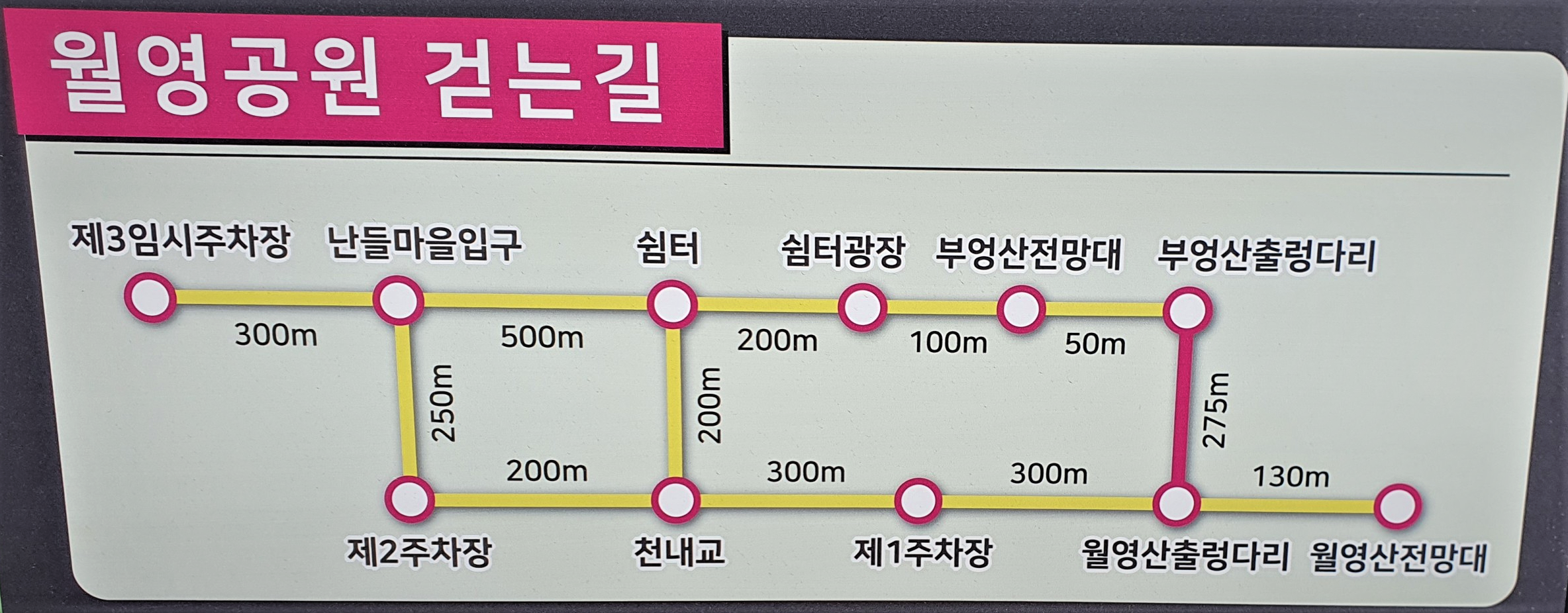월영산 주차장에서 출렁다리를 건너 부엉산 쪽으로 갔다가 주차장으로 돌아오는데 대략 한 시간 가량 소요된다.