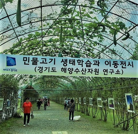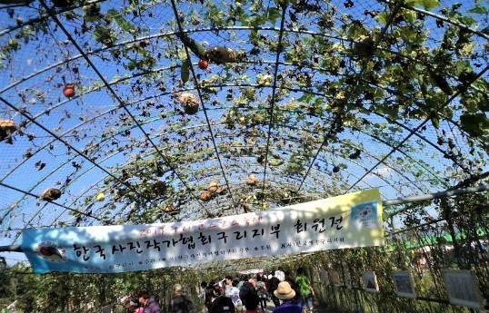 코스모스 길 초입에 있는 길이 200m의 ‘호박·수세미 터널’은 철제 아치형 뼈대를 타고 촘촘하게 오른 넝쿨마다 퉁퉁한 호박과 길쭉한 수세미가 주렁주렁 달려있어 마음을 풍성하게 한다.