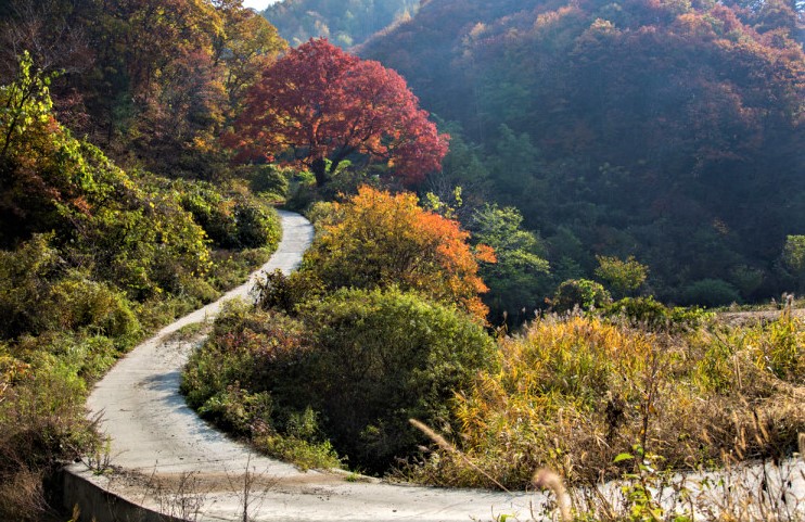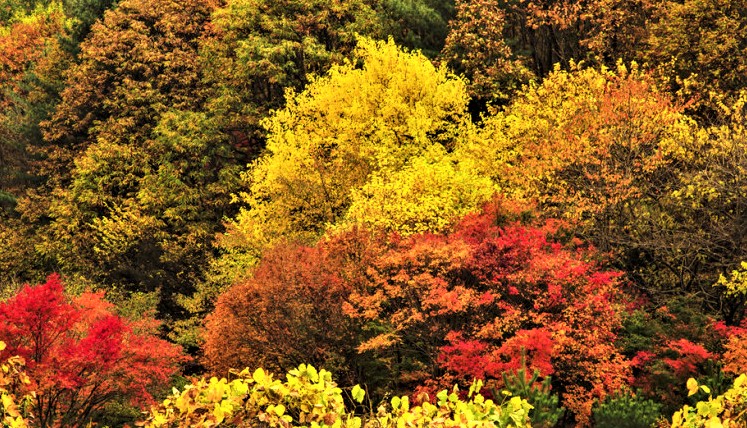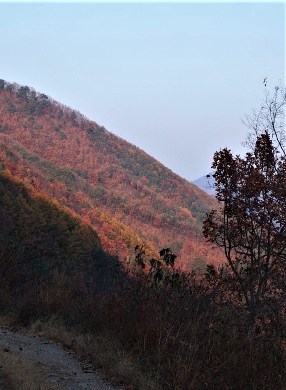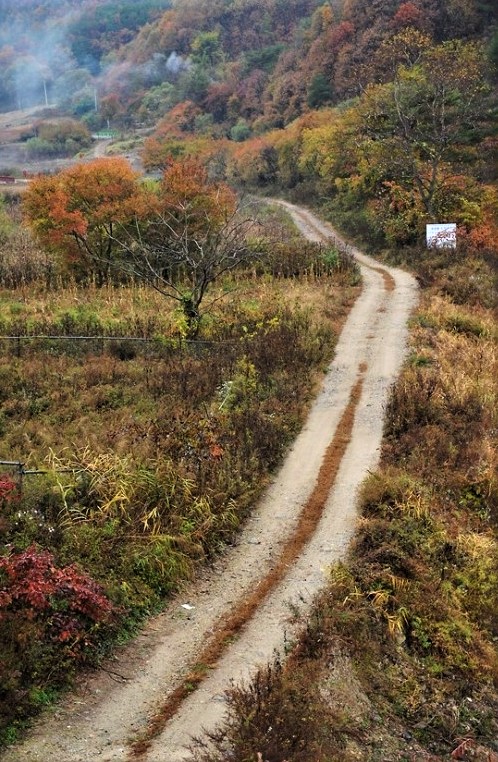오른쪽으로 진입하면서 다소 완만하던 길이 가파르게 솟구친다. 전망대에 이르면서 시야가 환하게 트인다. 수산리 일대는 수채화 물감을 뿌려 놓은 것처럼 울긋불긋 오색단풍으로 휘덮여 있다.