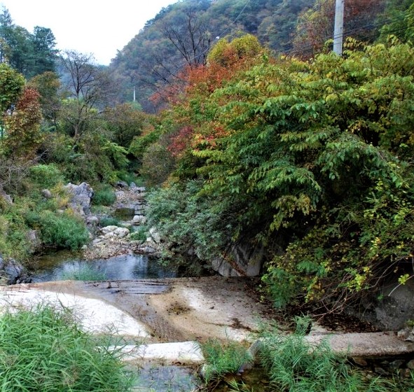 인제 자연학교캠핑장 앞에서 다리를 건너 올라가는 길에 엷은 흐름을 보이는 수산천이 있다. 소양호로 흘러드는 작은 하천이지만 티 하나 없이 맑고 깨끗한 청정하천이다.