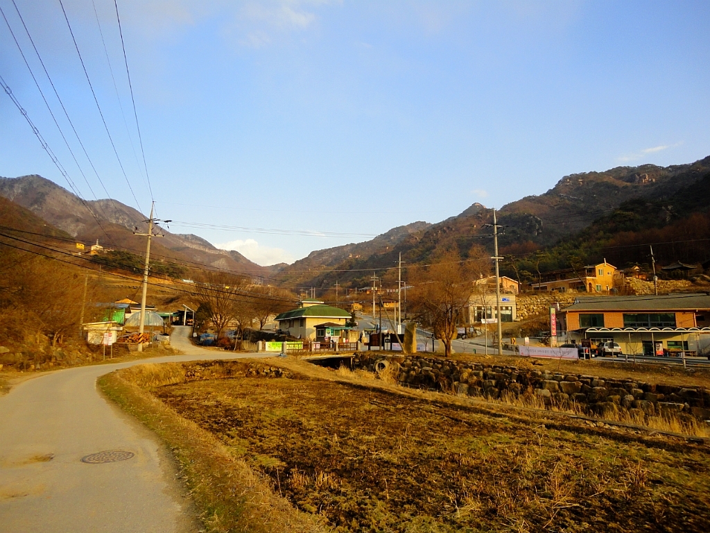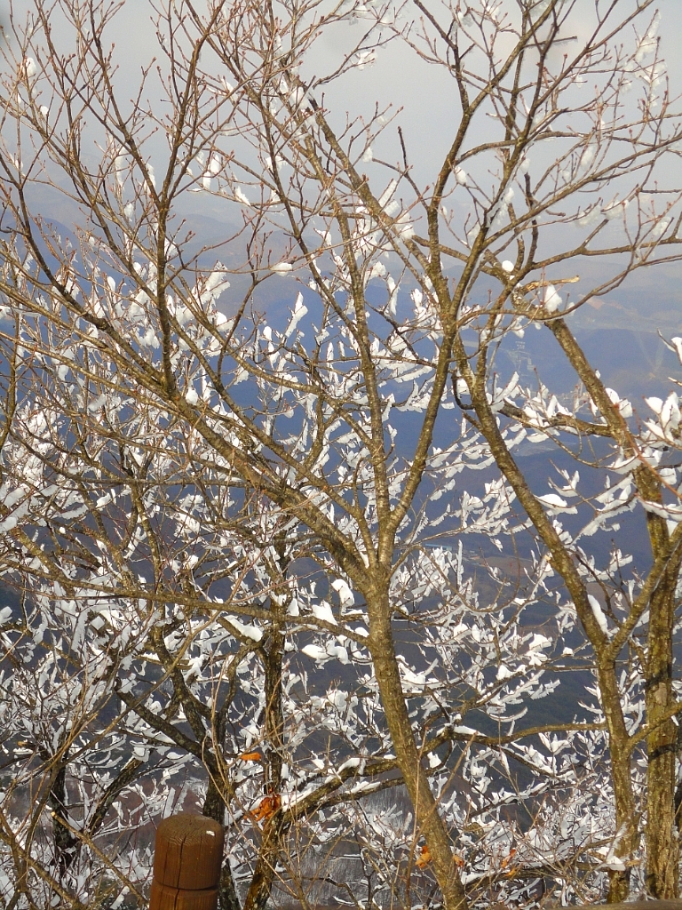 이제 겨울 땅에 접어들었다. 녹지 않고 굳어버린 눈밭을 걷게 되고 기온도 많이 떨어졌다. 바위 사이로 꽁꽁 언 얼음덩어리는 햇빛이 들지 않아 봄이 지나도록 녹지 않을 것만 같다. 저만치 금수산 정상 일대도 목화밭처럼 혹은 양 떼들 목장처럼 하얗게 덮여있다.